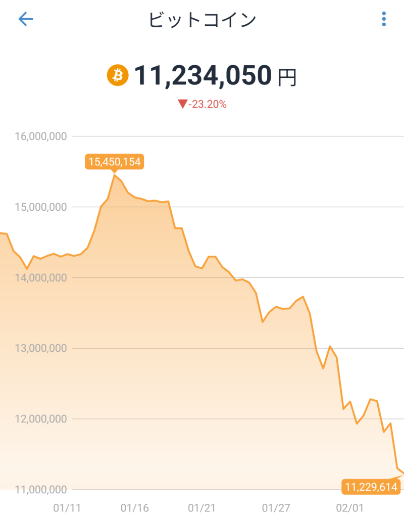 ビットコインが1年で30%減、イーサリアムが半年で50%減、リップルが半年で40%減、総額1000万以上飛んだぞ。税制改革される2028年まで放置予定だけど回復するといいなぁ。。。