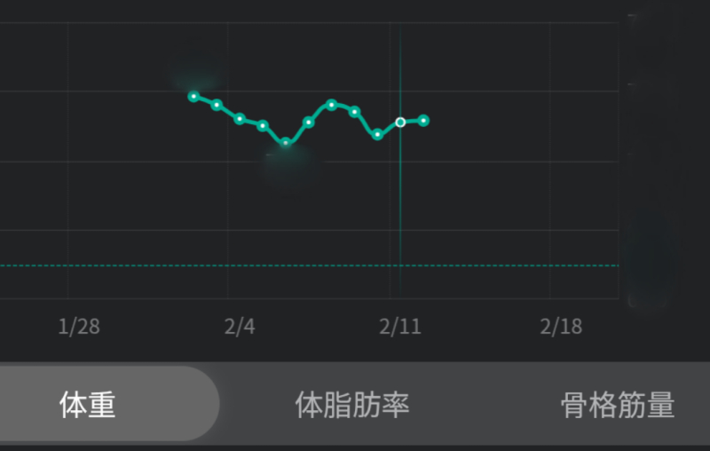 開始以降の体重推移。週末にかけて減少し、土日のジョギングとVRフィットネスで筋肉使ったので筋肥大に伴う水分量増加で体重増加って感じ。まあ今のところ予想通りの動きかな。