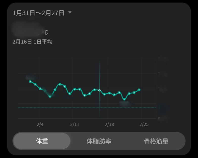 | 2/22(日) | 2632kcal(+600kcal※スマートウォッチ電池切れ) | VRで上半身で200kcal、ウォーキング無、ジョギングのみ、休日もりもり食べる | 12.5kg | 13.0kg |