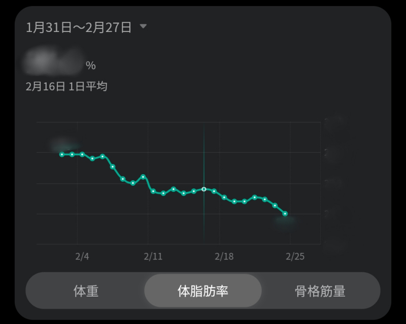 体脂肪率は停滞期を抜けて最近また下がりだした。3週間で合計3%減少。