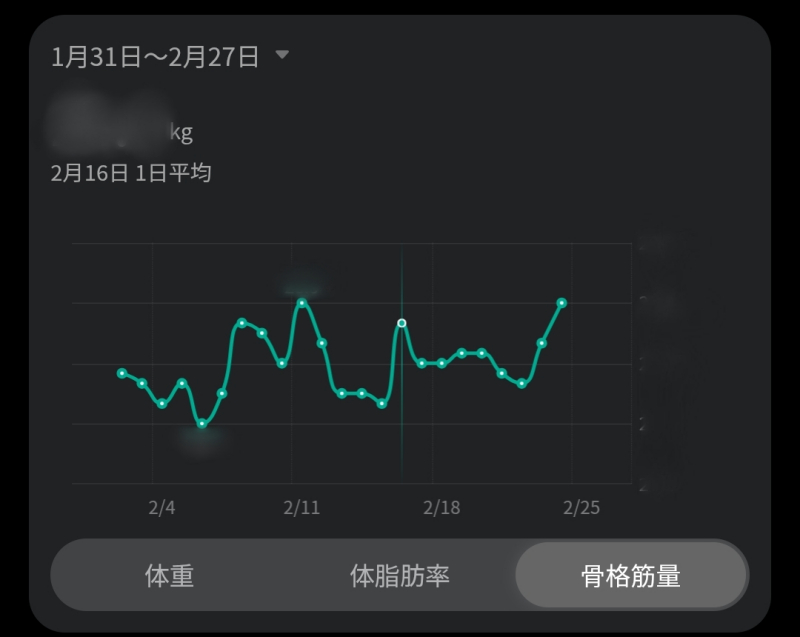 手に電極を持つタイプの体組成計なせいか、VRフィットネスで上半身を使うと骨格筋量が急上昇してあまりあてにならない感じ。骨格筋量はこの3週間の変動が1kgしかないので体重減少に伴って筋肉は減っていないって感じかな。