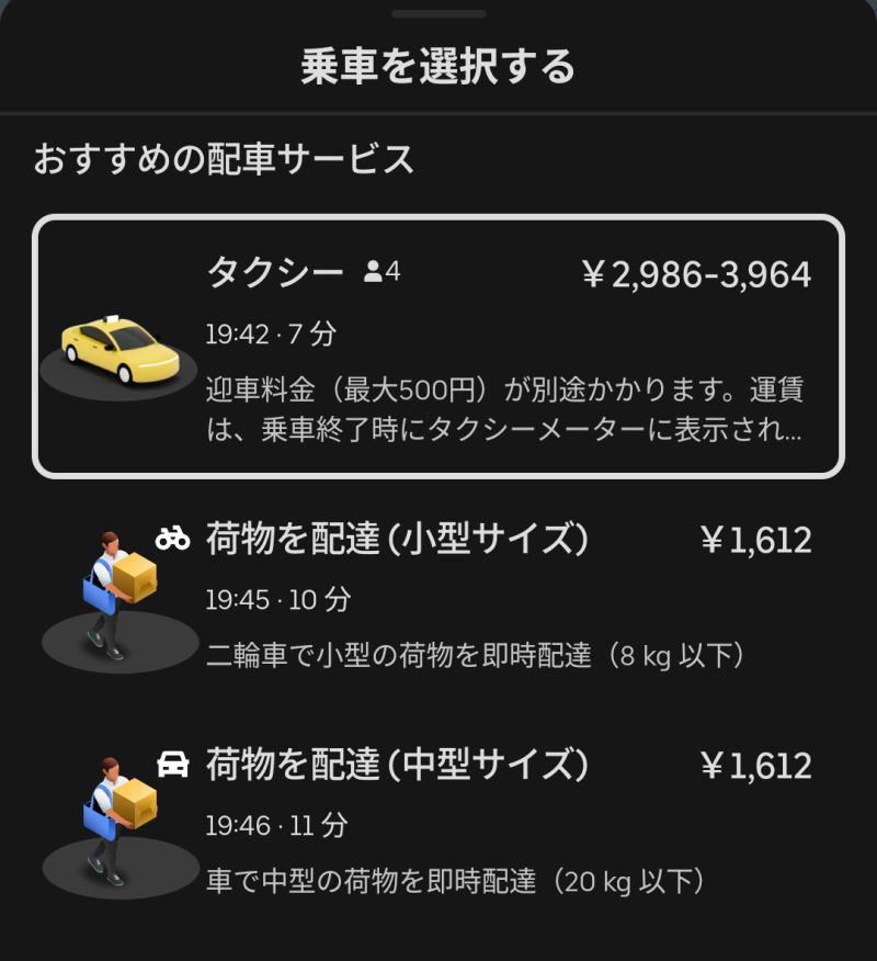配車は相変わらずタクシーしか呼べないうえに配車料金かかってクソなんだけど、荷物運びのオプションが表示されるようになっているね。