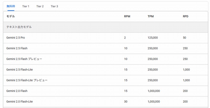 RPMってのが1分間のリクエスト数上限、RPDってのが1日のリクエスト数上限、TPMが1分あたりののトークン数(文字数)リセットはPT(カリフォルニア時間)でリセット、すなわち日本時間の午後4時か5時。