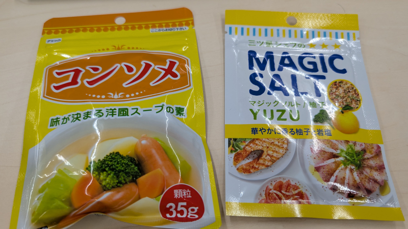 コンソメはまあ期待通りの味、柚子入りのマジックソルトは良い感じ。柑橘系の香味料はなかなか良いかもしれない。