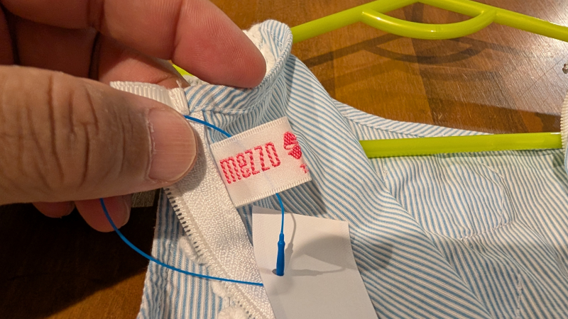 知らなかったメーカーだけど「メゾピアノ」と書いてある。ワンピース1500円。調べると元は1万円以上しそう。ムスメに着せるとお嬢様に見える。