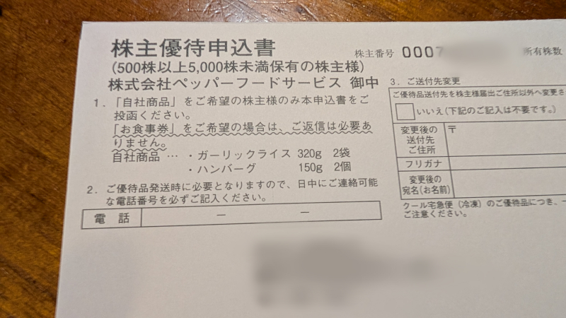 ↓500株持っていると半年に一度3000円のお食事クーポンor3000円分の自社製品がもらえる。