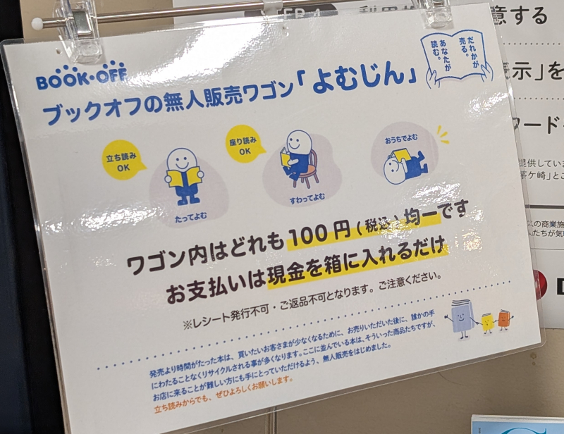 007 [08/12 04:07]ふぇちゅいんさんふぁん(ゆるりゆラリー)★102:よくよく見たら「お店に来ることが難しい方にも手にとっていただけるよう、無人販売をはじめました」て書かれてるな。これ、「無人販売コーナー」てタイトルしてるからブックオフの一角だと思ったんだけどそうじゃなくて、ブックオフとは無縁の場所でスポット的にやってるのか。それなら納得。 ↑(19)