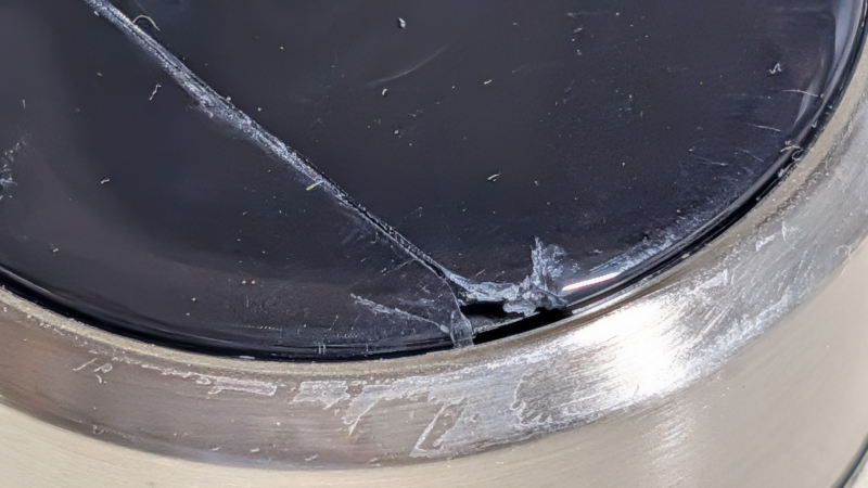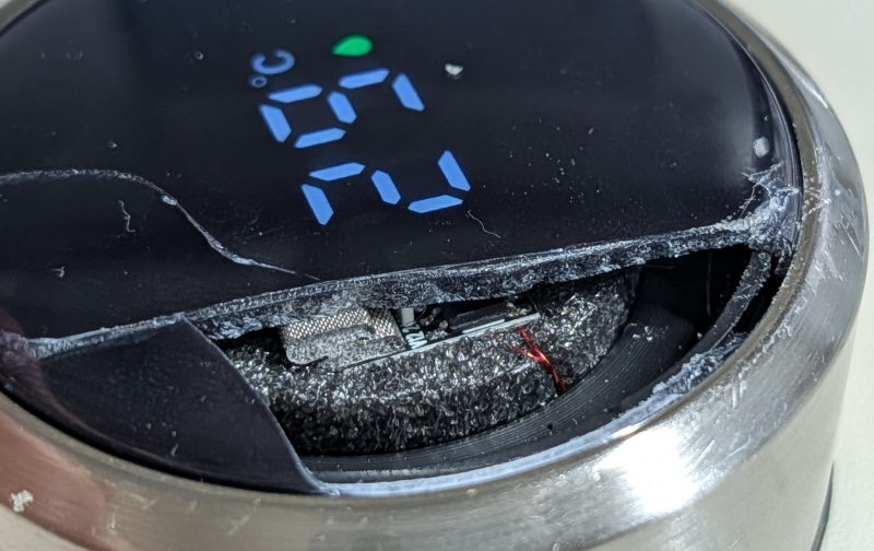 安かったし捨てるつもりでパネルをはがしてみる。電子基板が見えてきました。この水筒の天板はいわゆるタッチパネルになっていてボタンはどこにもない構造です。防水性はかなり高いと予想。