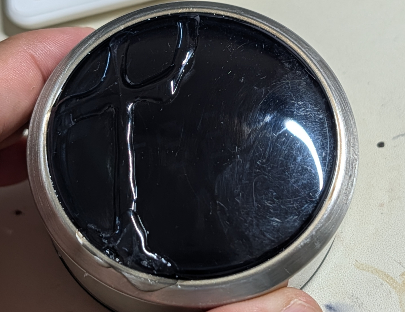 レジンが山状に盛り上がった状態です。このままでも何の問題も無く使用出来ると思いますが、ここからヤスリで削ってどこまで綺麗に出来るかテストしてみる予定です。