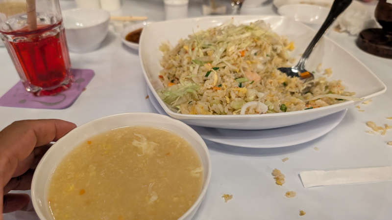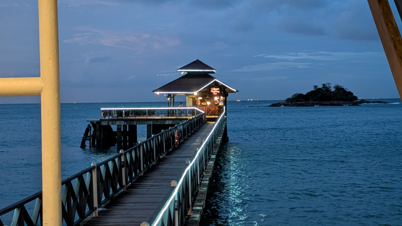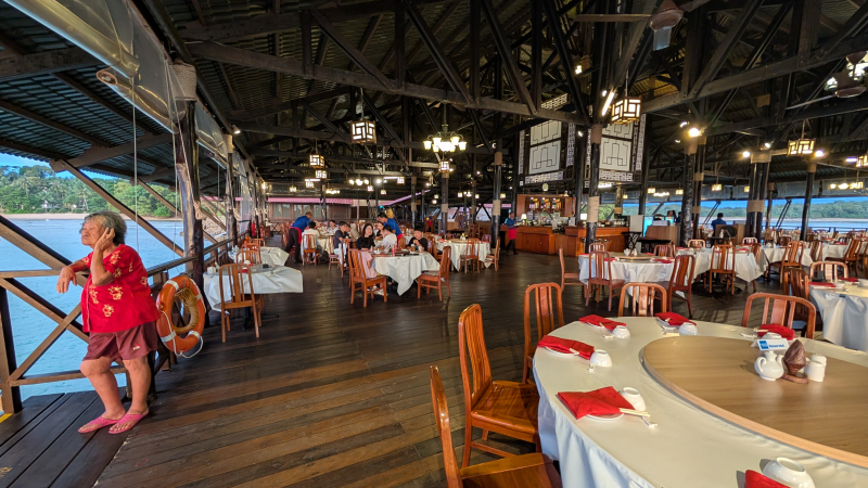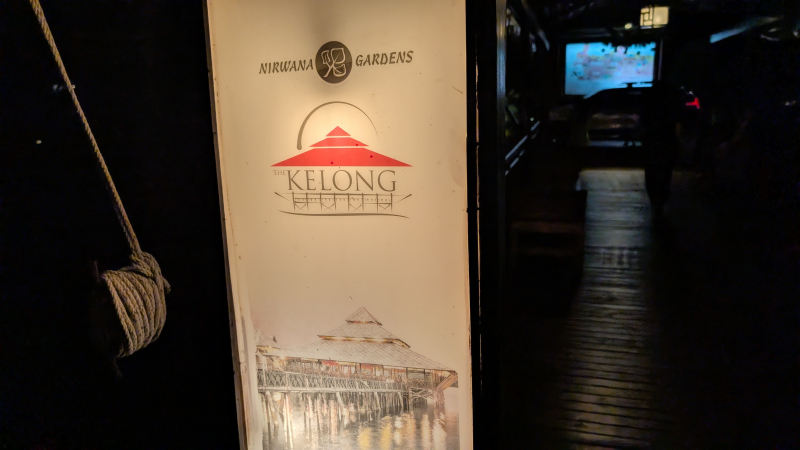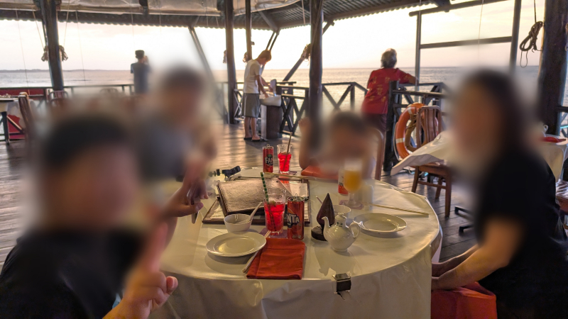 | 晴れでも曇りでも無い天気、そのうち薄暗くなるので、戻って、着替えて、島の西側の夕焼けがきれいにみれるらしい水上レストラン「ケロン」に向かう、残念ながら、一足遅く、向かう途中のタクシーの中で日が暮れてしまう。着いてみて思ったが、夕暮れにここにいたら、凄まじく綺麗なことだろう。また来よう。水上に建てられたレストランは自然の風でとても快適な環境、暑くないない。そこで食べた数々の料理はとても美味しかった。シンガポールよりも少し安い値段。かゆ、うまっ |