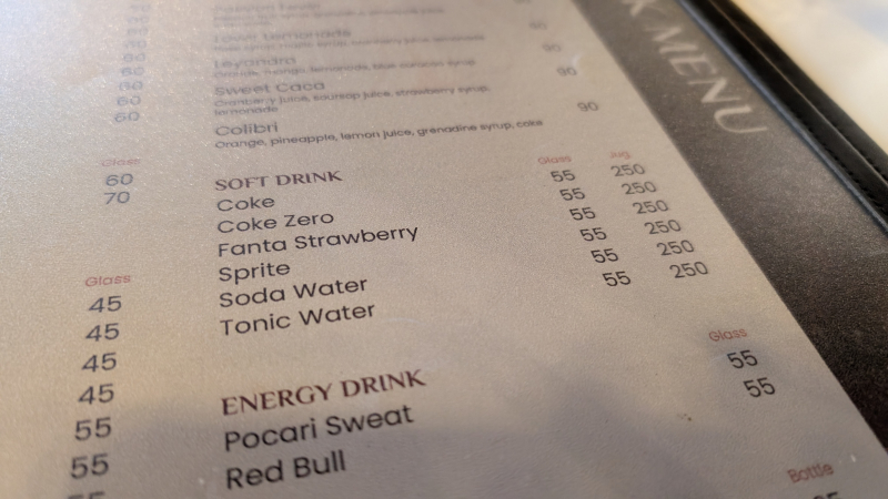 レストランの飲み物の値段。ポカリスエットもグラスで55(×1000)インドネシアルピア=500円ぐらい。