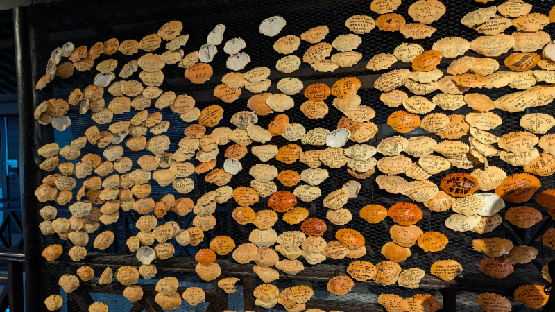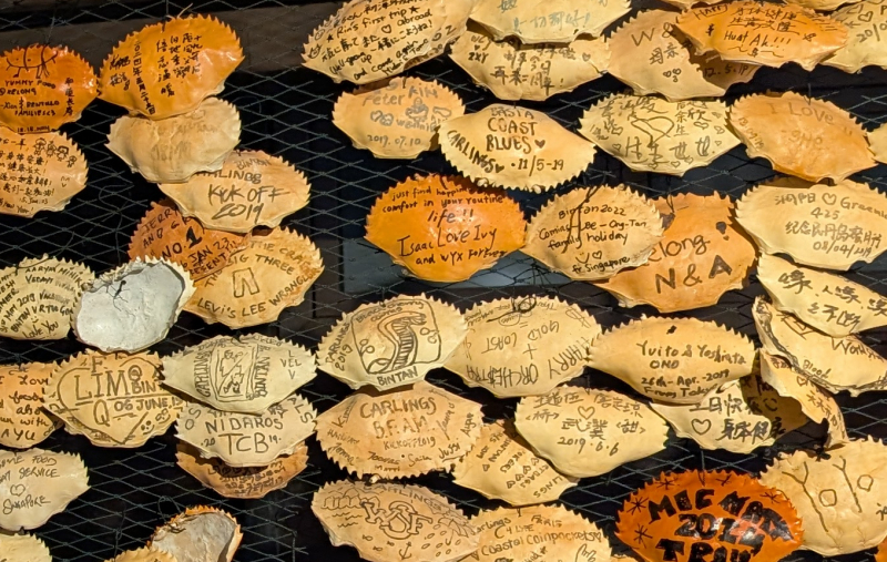 レストランの入口にカニの甲羅がたくさん飾ってありました。食べると記念に何か書いて残せるのでしょうか?頼めば良かった。