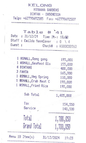 貝「Gong, gong」は19万5000インドネシアルピアなので2000円。けっこう高いか?ビンタンビール4本で40万インドネシアルピア=1本1000円、ファンタ3本(怒怒怒)、貝とか飲み物は高く感じるけど、食べ物はホテルよりは安い印象です。合計で170万インドネシアルピア=1万7000円高いなー。15年前からどれぐらい物価が変わっているんでしょうね?貝は「ぼんぼん」と聞き取っていたけどつづりは「Gong, Gong」だな・・・・