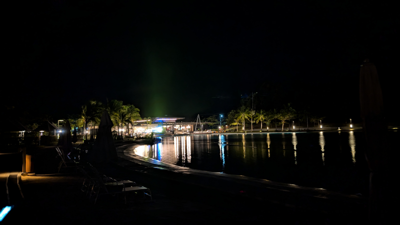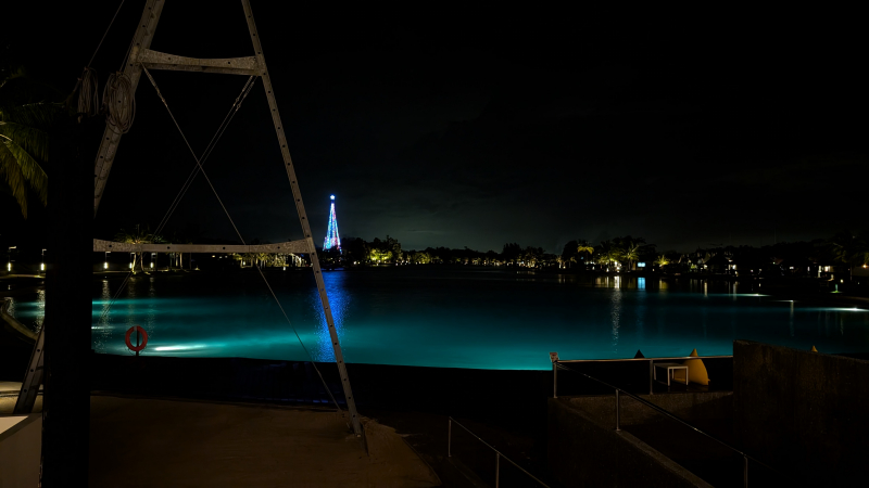 ホテルのレストランから人工ラグーンを見たところ。遠くに見えるイルミネーションは人工ラグーン3つ目のホテル「Treasure Bay Bintan」のあたりです。