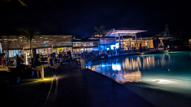 静かになった後の人工ラグーンのそばをお散歩中。遠くに見えるのがうちのホテルのレストランです。