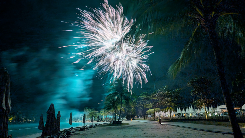 そして、午前0時にはカウントダウンとともに人工ラグーンの方で小さい花火がかなり大量に打ち上げられていました。隣のホテル「The ANMON Resort Bintan」の前の人口ラグーンあたり。ライブは午前1時にぴったり終了しましたた。