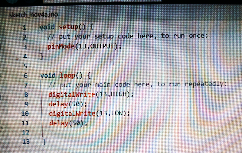 ↓スクリプトはこんな感じ。setupが起動時に時刻する部分、loopが起動後に繰り返し実行される部分とのこと