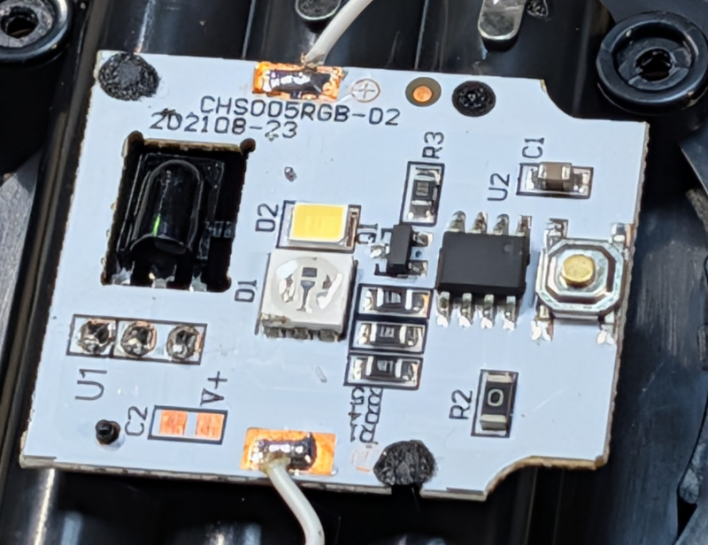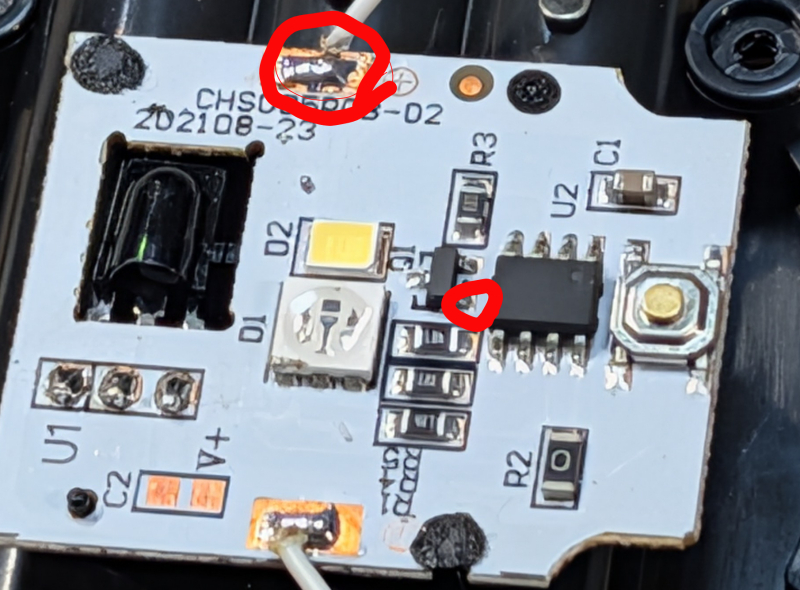 ・D1の下の3つは抵抗?、マルチカラーLED制御に加電している部分かも(確認していない)。もしそうなら4チャンネルぐらいの制御が可能かもしれない。