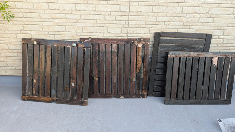 全体がかなり色あせていたので、屋内家具に塗ろうとして使わなかったウォールナット着色のウレタン入りニスを塗りまくる。見た目はかなり回復。屋外家具にウレタン入りは良いんだろうか?長い経験で分かったが、木材表面の防水度が高すぎると内部は湿った状態で維持されてしまいむしろ内部の腐敗が進みやすい気もするのでウレタン入りニスの防御力が高すぎるんじゃないかと懸念してしまう。