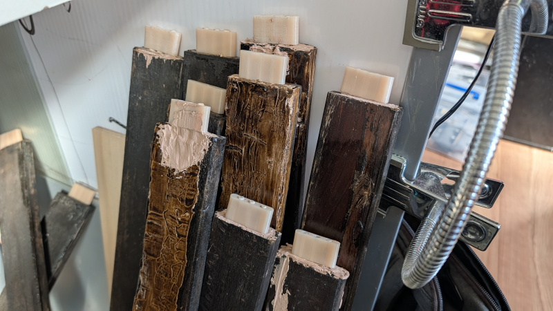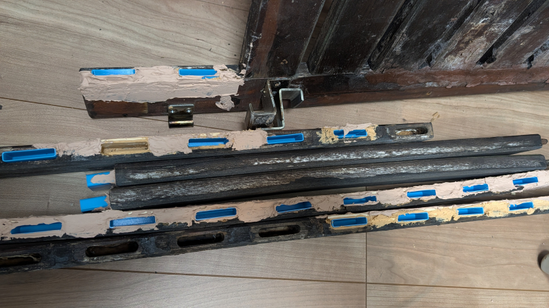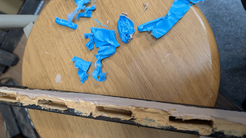 ほぞ穴の補修はこれまで通り。アクリル系ウッドパテと竹ひご、これに3Dプリンター(フィラメント:PETG)で作ったほぞ穴のソケット(水色)を組み合わせて再生。アクリル系パテは使い勝手が良くて安いんだけどエポキシ系に比べるとずいぶん強度は落ちるなぁ・・・