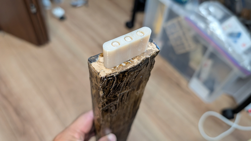 ↓死んでいるほぞは強度の低くなった部分を削ってアクリル系ウッドパテで充填して、3Dプリンター(フィラメントTPU)で作った人工ほぞと、ダボで再生。TPUは収縮性があるので少し大きめに作って無理やり押し込むと固定性が非常に高い。