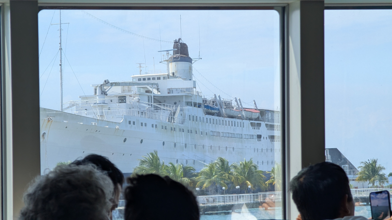 フェリーが出発してすぐに見えるこの船、実は動かない単なるホテルらしい。