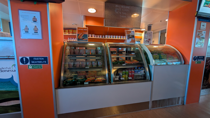 フェリーは並ぶのがそんなに早くなかったため窓際の席は取れず(座席指定ではない)、中央の売店の前に座りました。