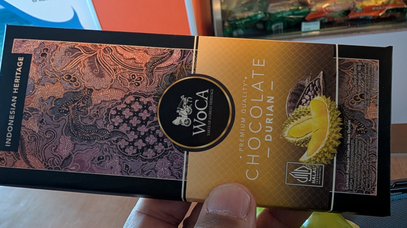 乗船手続きをしたあとも狭い空間で少し並びました。ヒマだったのでドリアンチョコを購入。変な味でしたが美味しかった。