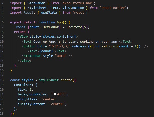 - このサンプル2にはサンプル1にあった「expo-status-bar」がimportされてないので必須ではないっぽい。