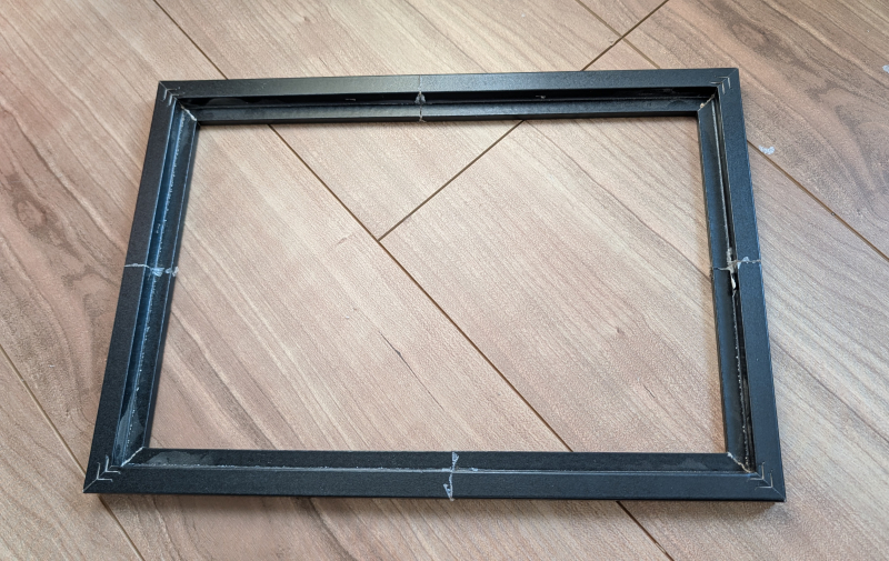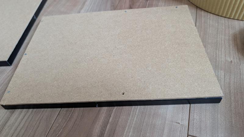 ↓作り方は同じ。ダイソーで220円で売っているA4用フォトフレームを分解してパーツを使用。A4サイズ(210mm × 297mm)から縦横を3.5cm程度縮めたサイズになるようにフレームを切断して木工用ボンドで少し小さめの枠として再構築、この後、板に固定するので強度は必要無し。