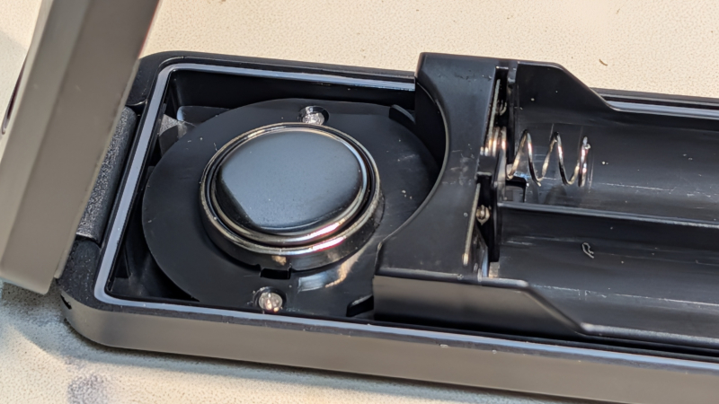 CR2032電池のように見えますが、本体に固定されているダミー電池です。裏面から電線が出ており単3電池に接続されています。