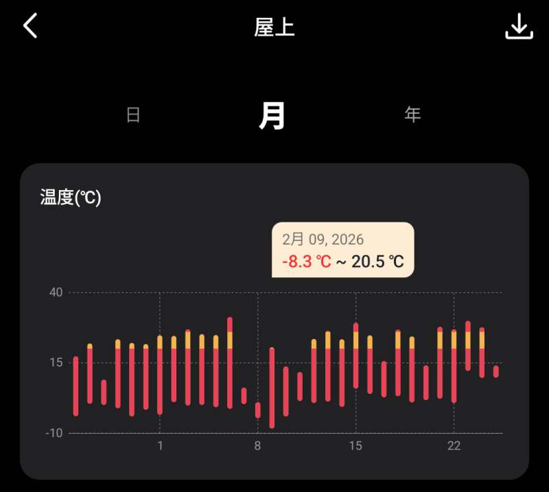 あ、2月9日に設置場所のルーフテラスの温度がマイナス8.3度まで下がっている。これだな。その前日なんて最低気温がマイナス4.6度、最高気温がプラス1度しかない。こりゃ凍結するな。