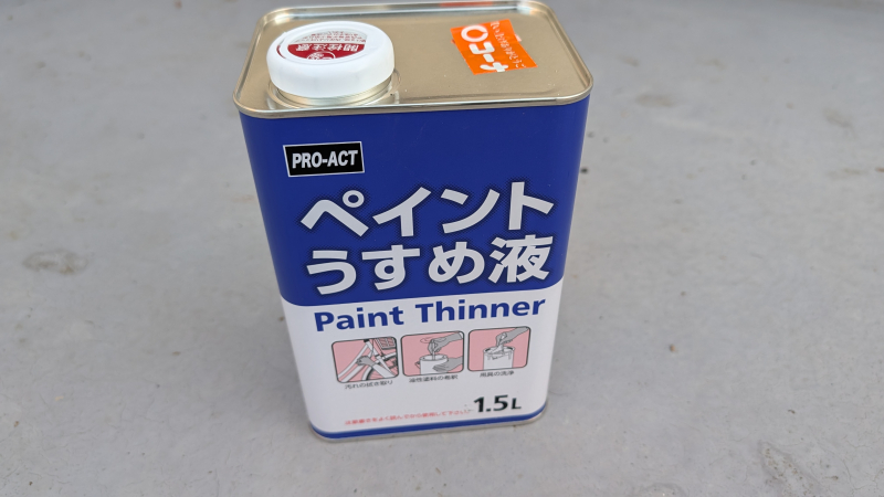 ↓説明書きに習い、表面を細かめのサンドペーパーで軽く削って、モップブラシできれいに清掃した後にこのペイントうすめ液で拭いて脱脂し、乾いた後に塗りました。