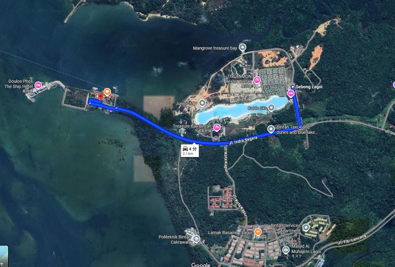 周辺の地図、左上の出っ張っているところがフェリーターミナル。右上の人工ラグーンの右端がホテルのエントランス。2kmほどの距離ですね。周囲は森ですが、走ったり歩いたりして自分でいけそうですが、よく知らない場所なので滞在中に自分だけで外出はしませんでした。どれぐらいの治安なんだろうか。