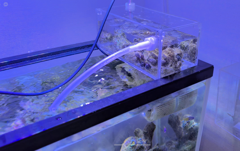 下のサンプから戻ってくる水の一部を内径4mmのチューブで少しだけこのサブ水槽に供給して溢れた分はメイン水槽に戻る仕組みです。
