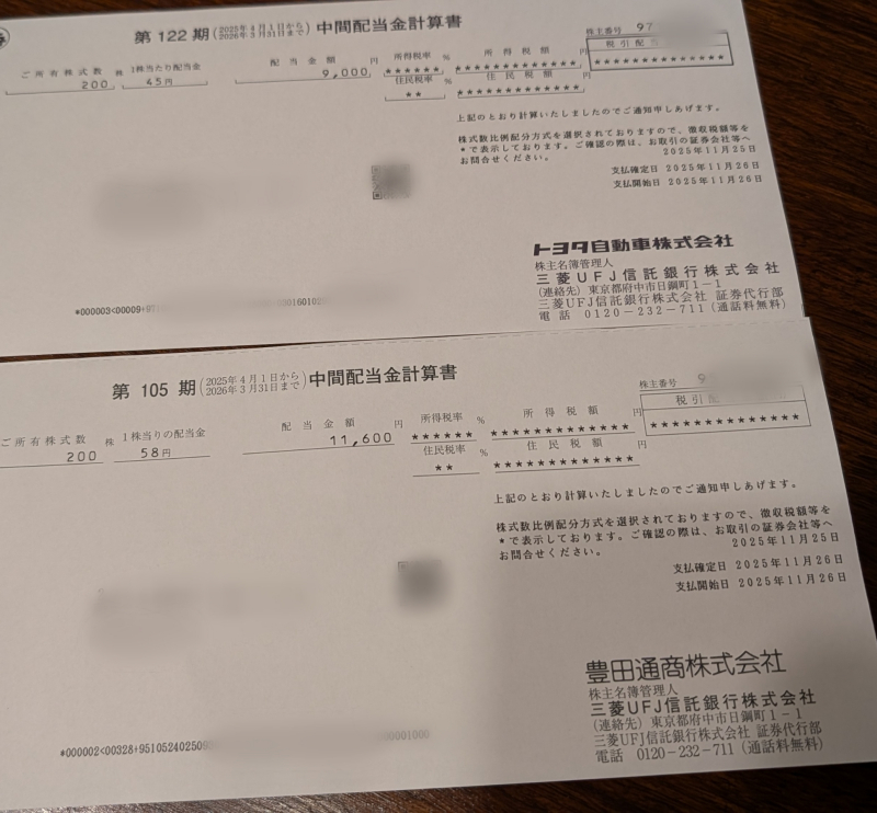 ●トヨタ自動車と豊田通商から配当金が着弾1 コメ