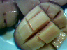 3枚に切って、サイの目状に切れ目を入れて実を反らしたところ。