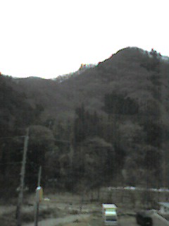 車窓から山を見ると緑の先々が黄色から茶色に染まってる!良く見ると風で粉のようなものが飛んでいるように見える。