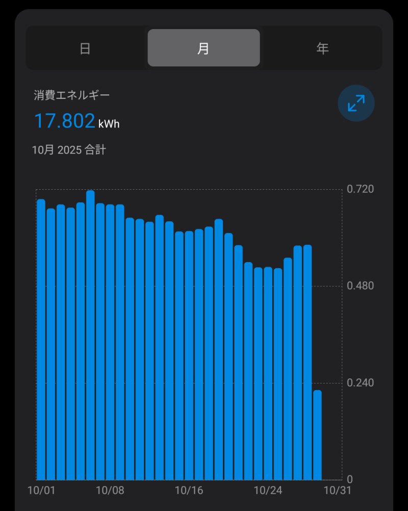 10月の始めは1日あたり0.7kWhぐらい、最近寒くなってきたせいか徐々に下がってきて0.5kWhぐらい?