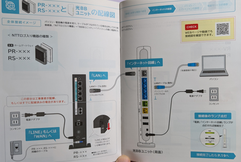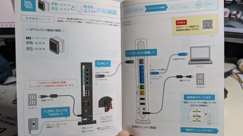 - 光BBユニットのLAN側の端子にこれまでPR-600KIに接続されていたLANケーブルを接続、有線でインターネット接続可能であることを確認。