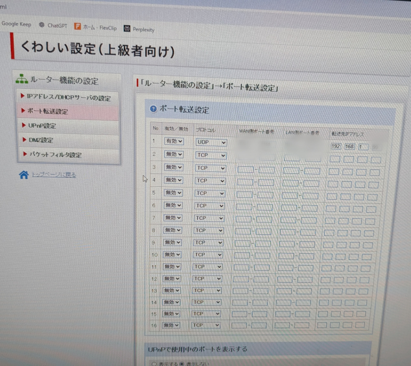 - 光BBユニットにVPNのためのポート転送設定を実施