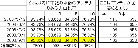 2kmグリッドモデルにより計算した独自の人口カバー率(住居登録されている場所の2km以内にアンテナがある人口比率)は1ヶ月間で93.79%→93.80%と0.01%(12809人)増加、2km以内に3本以上アンテナがある人の比率は1953人増加。周辺に5本以上の人は減少、10本以上アンテナがある人は6874人増加。